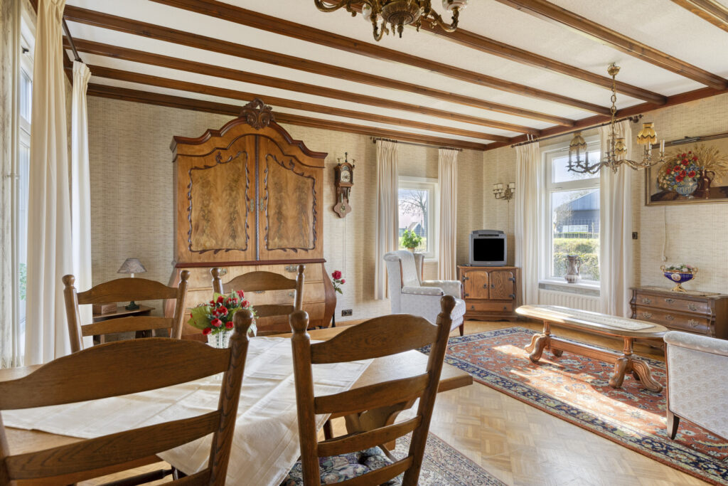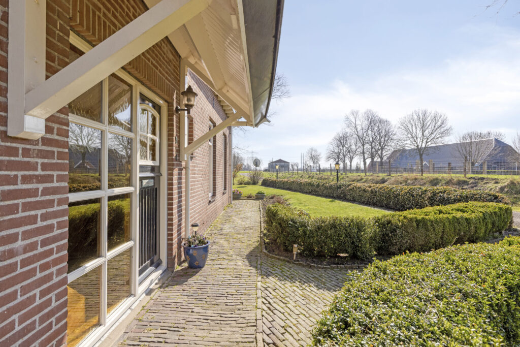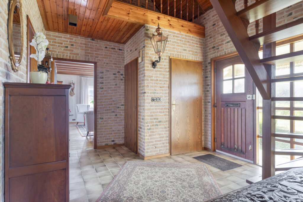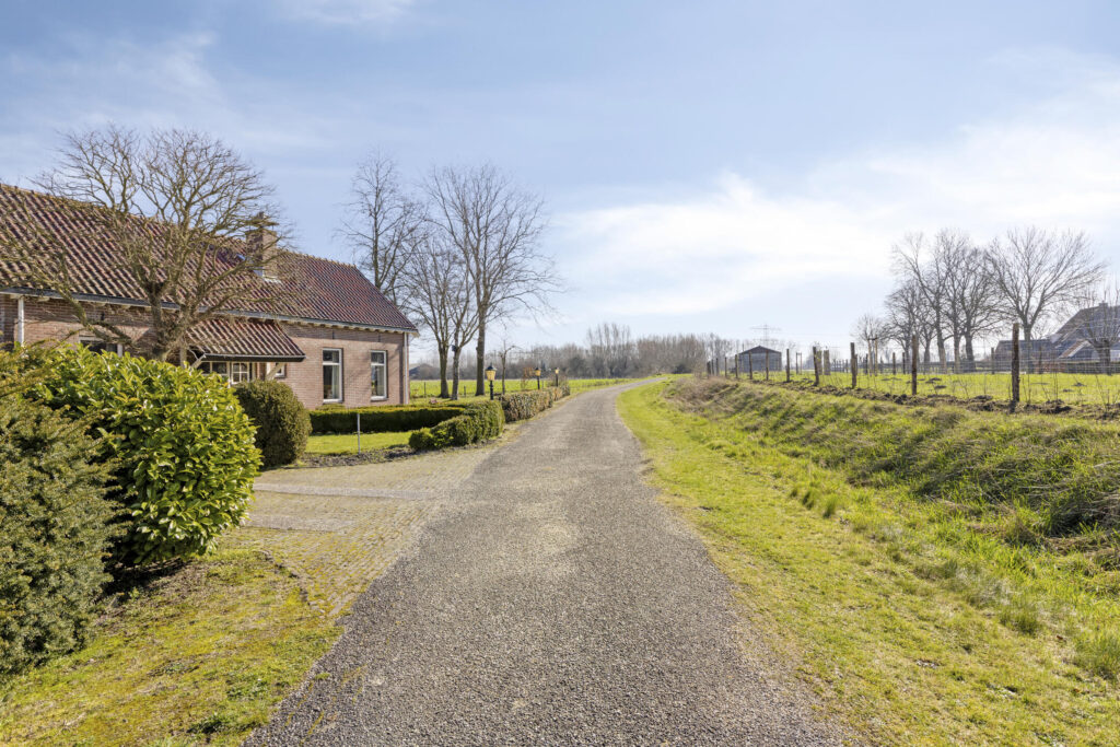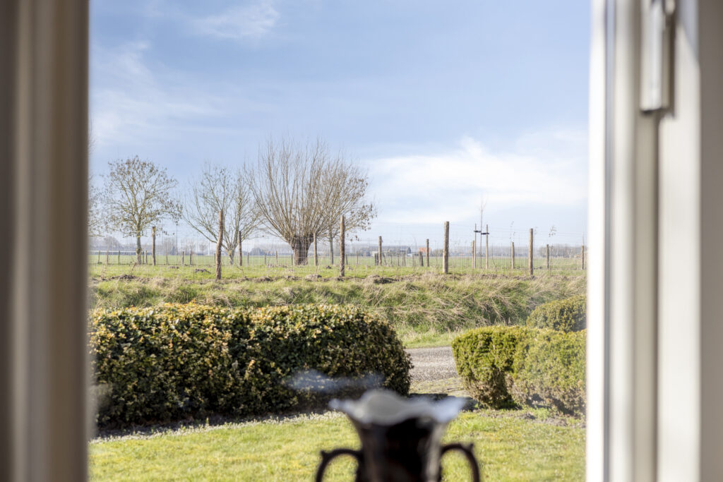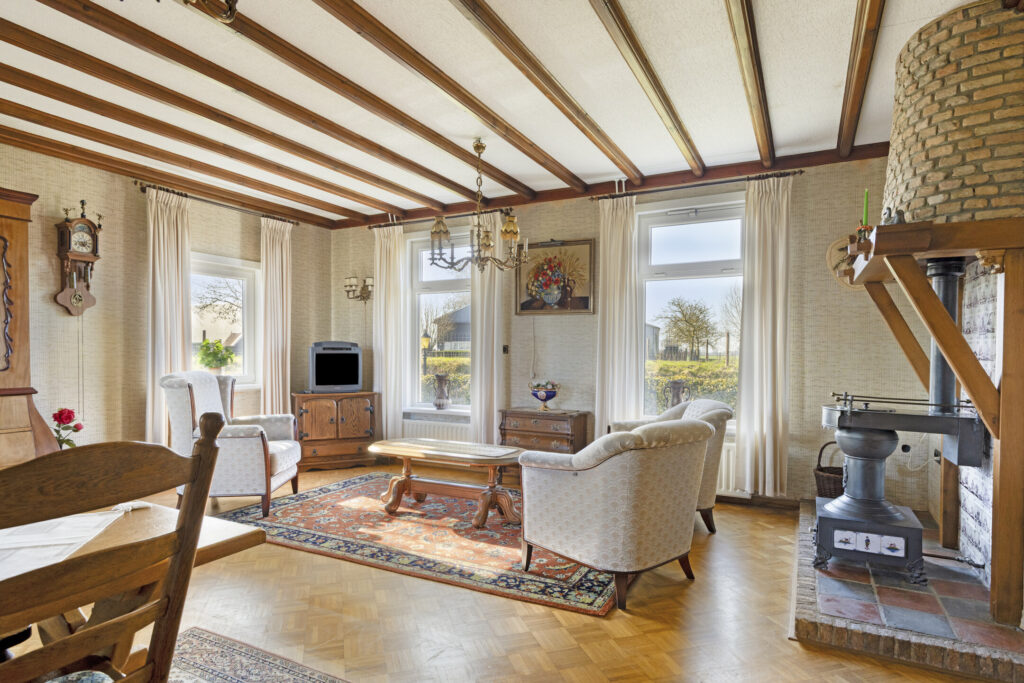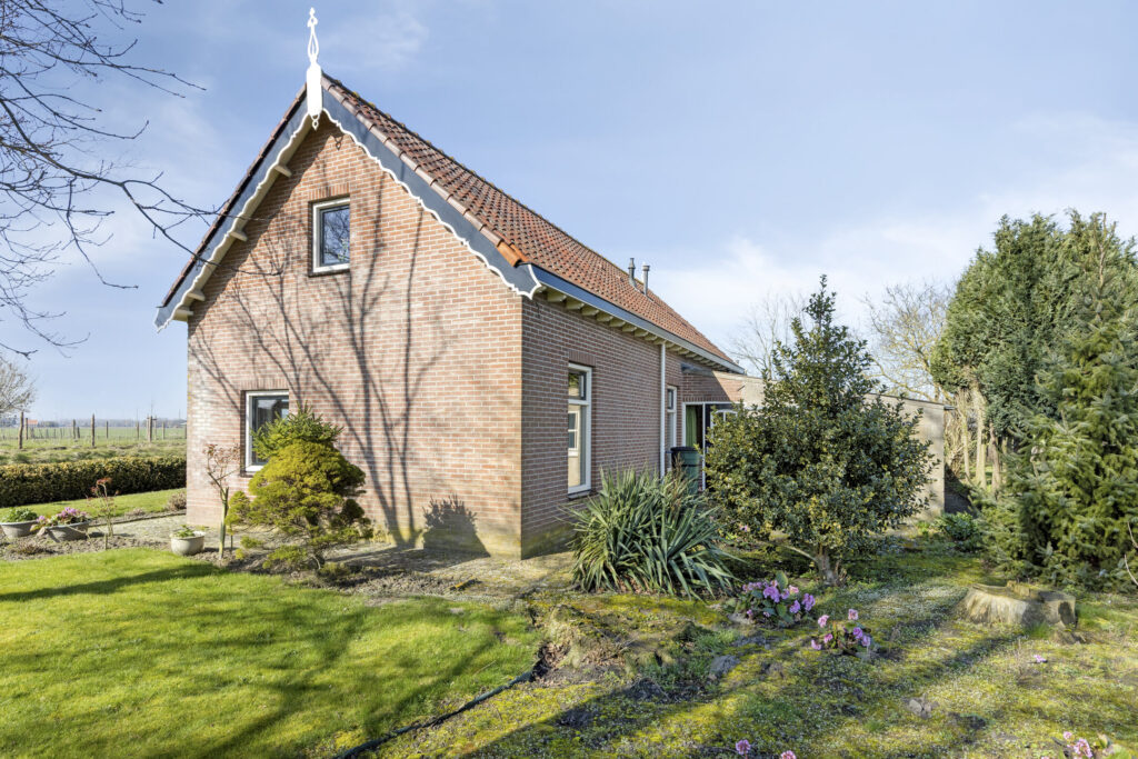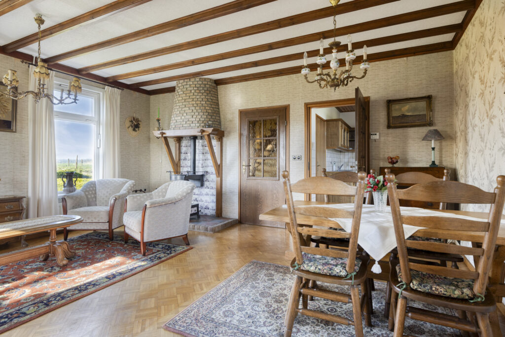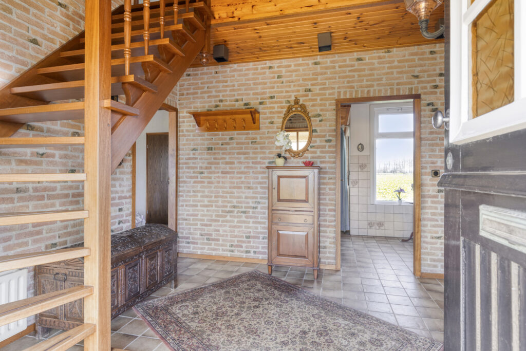 Zodra je vanaf de hoofdweg de zijweg inslaat richting je eigen perceel, valt de hectiek van de dag direct van je af. Je parkeert de auto op je eigen oprit en stapt via de voordeur de ruime hal binnen. Hier vind je de meterkast (7 groepen en dubbeltariefmeter), een radiator en een toilet met fonteintje. Vanuit de hal heb je toegang tot de belangrijkste vertrekken van het huis. De woonkamer is een absolute blikvanger. Door de vele raampartijen stroomt het daglicht van alle kanten naar binnen, maar het is vooral het uitzicht dat je zal raken. Aan de achterzijde kijk je vrij weg over de polders. De schouw met kachel vormt het hart van de kamer, waar je een sfeervolle zithoek creëert. Daarnaast is er meer dan genoeg plek voor een grote eettafel waar je urenlang kunt natafelen met het landschap als levend schilderij op de achtergrond.